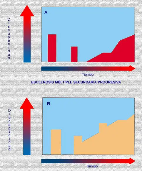 Comienza como una esclerosis múltiple de brotes y recaídas (A) y evoluciona hacia el tipo progresivo aunque puede haber alguna pequeña mejoría (B)
