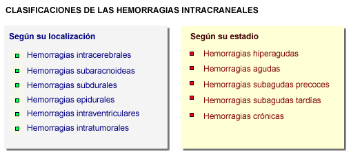 La clasificación de las hemorragias según el tiempo desde el momento de su inicio es hoy posible gracias a la resonancia magnética que es capaz de distinguir entre los diversos productos de metabolización de la hemoglobina (oxihemoglobina, metahemoglobina, desoxihemoglobina, etc) , los cuales dependen a su vez del compartimento en el que se produjo la hemorragia y del tiempo transcurrido. |