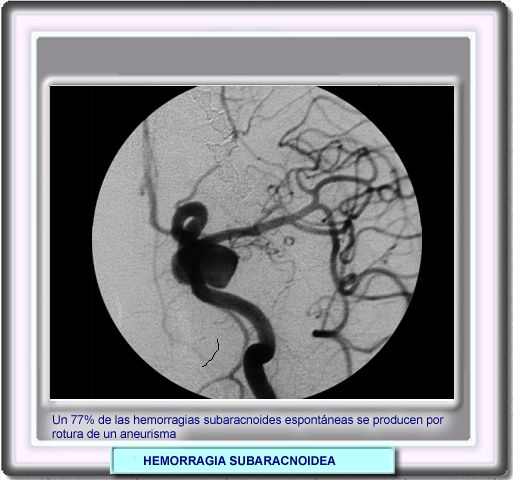La mayor parte de las hemorragias subaracnoideas no traumáticas se producen por ruptura de un aneurisma. De estas aproximadamente, el 85% se produce por la ruptura de alguno situado en la parte inferior del polígono de Willis. Los aneurismas gigantes de más de 2 cm de diámetro aparecen en las mismas localizaciones que los de menor tamaño. Las tres localizaciones más frecuentes son la arteria carótida interna intracraneal, la bifurcación de la arteria cerebral media y la parte superior de la arteria basilar El saco aneurismático es histológicamente una pared arterial adelgazada, de tejido fibroso con solo la capa íntima y la adventicia, sin componente muscular con disgregación y rotura de las capas de fibras elásticas. Se atribuye el aneurisma a un estrés hemodinámico y a la hipertensión arterial. |