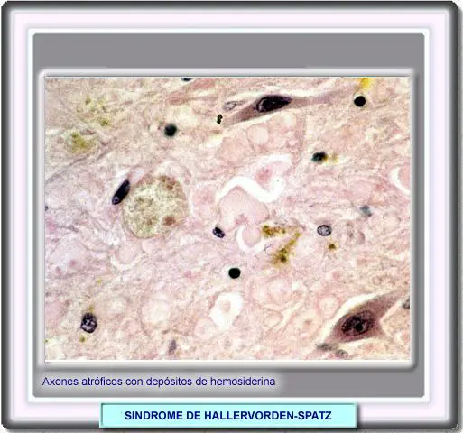 Histológicamente, la enfermedad se caracteriza por depósitos de hierro localizados en astrocitos, células microgliales y neuronas; también se localizan extracelularmente, algunas veces alrededor de los vasos sanguíneos. Otro hallazgo son lesiones asimétricas del globus pallidus, especialmente del segmento interno y la pars reticulata de la sustancia nigra caracterizada por la pérdida de fibras mielínicas y de neuronas, junto a gliosis. Por último destaca la presencia de estructuras ovales o redondeadas ampliamente diseminadas tanto en cerebro como en médula espinal, más numerosas en globus pallidus y en sustancia nigra, llamadas esferoides y que corresponden a axones edematosos Es decir, la triada neuropatológica está formada por los depósitos de hierro en las zonas señaladas, pérdida neuronal con gliosis en globus pallidus y substancia nigra y por último, la presencia de esferoides o tumefacción de los axones |