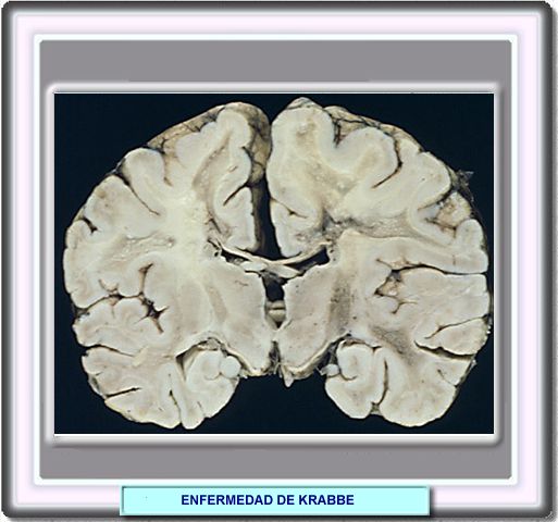 También denominada leucodistrofía de células globoides, la enfermedad de Krabbe es una enfermedad hereditaria por depósito lisosomal debida a la deficiencia de una enzima, la galactosilceramidasa, responsable de la hidrólisis varios galactolípidos incluyendo la galactosilceramida y la psicosina. El gen que codifica esta enzima se localiza en el cromosoma 14q21-q3. Se conocen al menos 40 mutaciones de este gen. El funcionamiento deficiente de la galactosilceramidasa produce la acumulación de ceramidas en las células nerviosas que adquieren un aspecto globoide