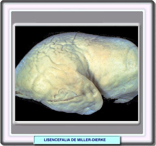 Un defecto del desarrollo del cerebro caracterizado por una superficie lisa de la corteza cerebral, asociada a una ausencia de giros (agiroa) y un engrosamiento de la corteza cerebral y otras malformaciones. Las mñas fecuentes son microcefalia y anormalidades en los riñones, corazón, sistema digestivo y otros órganos. El sujeto muestra unos rasgos faciales característicos y retraso mental La lisencefalia fué considerada como sinónimo del síndrome de Walker-Warburg y del síndrome de Norman-Roberts. Hoy día, se la considera como un componente de los síndromes de Miller-Dieker y de Norman-Roberts syndromes, aunque también puede ocurrir como una entidad separada. also occurring as a separate entity; Type II the Walker-Warburg and muscle-eye-brain syndrome, also occurring in the Neu-Laxova syndrome |
