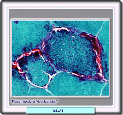 Una de las características más tipicas de las enfermedades mitocondriales es la presencia de fibras "rasgadas". Este aspecto se observa en la MELAS. MERRF(epilepsia mioclónica con fibras rojas "rasgadas") y el síndrome de Leisch. La lactoacidosis en sangre y en líquido cefalorraquídeo es un hallazgo común. |
