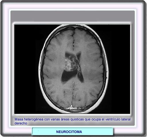 Radiológicamente, los tumores se identifican como masas intraventriculares, a veces de gran tamaño. Las tomografías permiten identificar las calcificaciones, mientras que las RMs muestran masas isointensas con la corteza o con una señal elevada en las imágenes en T1 y T2. La administración de un medio de contraste suele provocar un resalte homogéneo, si bien si existen áreas quísticas o calcificadas, el resalte puede ser más heterogéneo.