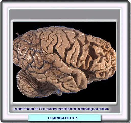 La demencia o enfermedad de Pick es una demencia progresiva definidad por criterios clínicos y patológicos precisos. Mientras que la enfermedad de Alzheimer y otras demencias que presentan déficits cognitivos afectan la corteza parietal, la enfermedad de Pick afecta sobre todo los lóbulos frontales y/o temporales Hoy día, se considera que forma parte de un complejo de desórdenes neurodegerativos con unas características histopatológicas y clínicas similares llamado "complejo de Pick" o demencias fronto-temporales (*) En la demencia de Pick, la atrofia cerebral es más pronunciada que en la enfermedad de Alzheimer y más circunscrita. Son notables la depresiones entre los giros y la abrupta transición entre la zona afectada y la normal. La demencia de Pick suele iniciarse asimétricamente en los lóbulos frontales, progresando seguidamente hasta afectar el lado opuesto y los lóbulos temporales. |