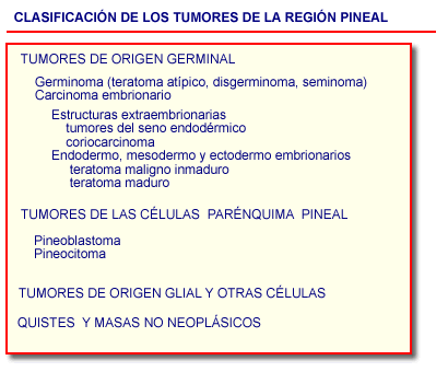 La glándula pineal se localiza en la porción posterior del tercer ventrículo. Los tumores en esta región son bastante raros, suponiendo tan solo el 1% de todos los tumores intracraneales. En los niños son algo más frecuentes (3-8%). La mayor incidencia se observa entre los 20 y 30 años. En todos los casos, los germinomas son los más frecuentes con un 33 a 50% de todos los tumores. En segundo lugar se encuentran los gliomas que suponen un 25% de todos los tumores pineales |