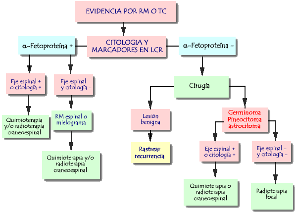 La radioterapia es el tratamiento de elección. Los índices de supervivencia a 5 años oscilan entre el 44 y el 78% dependiendo de la histología del tumor y de su extensión. La respuesta es mejor para los germinonas (72%) que para los teratomas (21%) En el caso de los germinomas se han observado respuestas positivas con cisplatino, bleomicina y ciclofosfamida solas o con asociaciones de ciclofosfamida, vincristina y bleomicina. En algunos casos, se han llegado respuestas del 91%, por lo que muchos autores sugieren una reducción de la radioterapia completando el tratamiento con fármacos antitumorales. Las combinaciones más empleadas son las que incluyen ciclofosfamida, vinblastina, y bleomicina; cisplatino, bleomicina y tenoposide; cisplatino y etoposide; y finalmente, cisplatino, vincristina y bleomicina. |