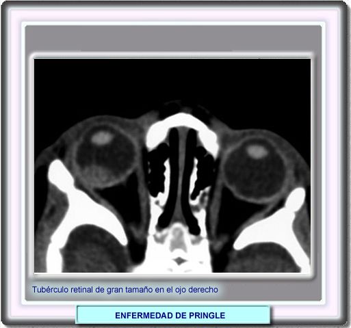 Facomas Otros hallazgos radiológicos son los tubérculos retinales, tumores benignos denominados facomas, que aparecen como masas blancas en la retina. Generalmente, no causan pérdida de la visión, pero pueden ayudar a definir el disgnóstico |