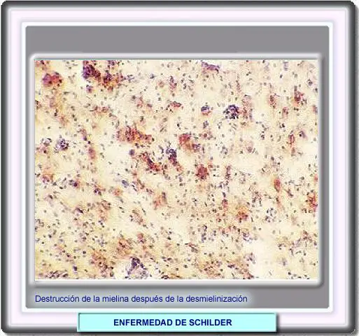La histolopatología muestra como, después de la desmielinización, el mielina es destruída El estudio del liquido cefalorraquídeo muestra pleocitosis, presencia de polimorfoneucleares en grandes cantidades y puede o no existir síntesis intratecal de inmunoglobulinas y bandas oligoclonales Algunos autores asimilan la enfermedad de Schilder como una adrenoleucodistrofia ligada al cromosoma X La enfermedad comienza en la niñez con un cuadro clínico caracterizado por afasia, demencia, signos corticoespinales, pérdida de visión por neuritis óptica con edema de papila o ceguera cortical, signos debido a compromiso de troncoencéfalo como nistagmus y oftalmoplegia internuclear, convulsiones, psicosis aguda y signos de hipertensión intracraneana El tratamiento de este desorden sigue las pautas del de las esclerosis múltiple e incluye corticosteroides, beta-interferon o terapia inmunosupresora y tratamientos sintomáticos |