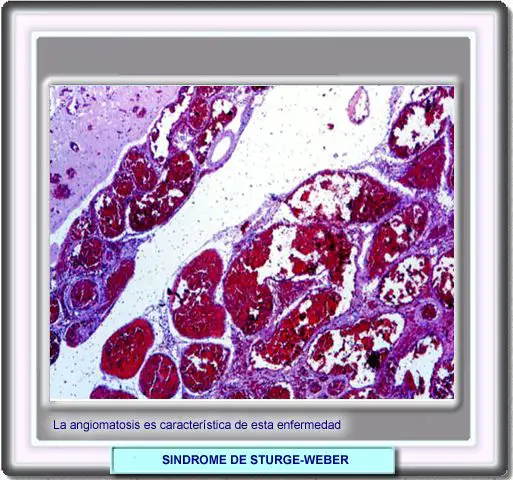 Las hallazgos microscópicos típicos del síndrome de Sturge-Weber son la angiomatosis, mineralizacion (fosfatos y sales de calcio) y degeneración atrófica del parénquima proximo con gliosis reactiva y pérdida de neuronas formando parches. También se observa ectopía glangliónica y proliferación de células capsulares |