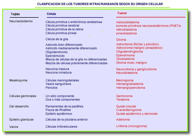 La diversidad en los tumores intracraneanos y del eje espinal resulta de la diversidad de las células fenotípicamente distintas susceptibles de experimentar una transformación. Al menos 15 tipos de células diferentes pueden originar tumores.