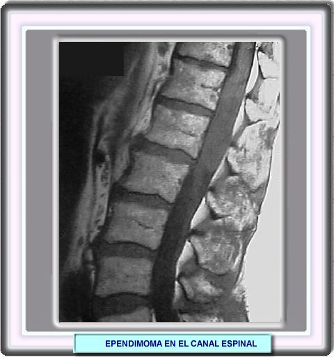 Los ependimomas mixopapilares son tumores que crecen típicamente en el filum terminale y cono medular. Se trata de tumores de crecimiento lento que pueden alcanzar un gran tamaño. Afectan más a varones que a mujeres (2:1) y la edad media de diagnóstico se sitúa en la tercera década La manifestación clínica predominante es el dolor lumbar, que en la mayoría de los casos se asocia a pérdida de fuerza en miembros inferiores. En algunos casos se presenta disfunción de esfínteres, y anestesia en silla de montar. La localización tumoral más frecuente es la región lumbar alta, fundamentalmente a la altura de los cuerpos vertebrales de L1 y L2. |