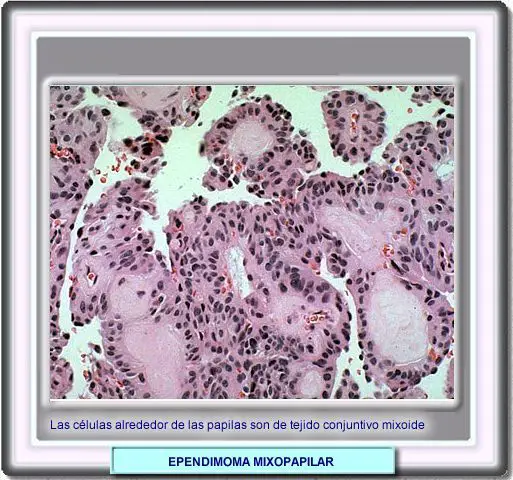 La histología de los ependimomas mixopapilares muestra células fibrilares con pequeños núcleos ovales y acumulaciones de mucina entre islotes de células tumorales y los vasos sanguíneos. Alrededor de estos, se forman las rosetas mixopapilares que separan los vasos de las células tumorales. Los ependimonas mixopapilares son un subtipo de ependimoma usualmente localizado en la cauda equina o el filum terminale (95% de los casos). |