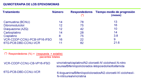 | Debido a la baja incidencia de los ependimomas y de que hasta la introducción de la resonancia magnética eran dificiles de diagnosticar, no hay demasiados estudios clínicos que hayan estudiado la eficacia de cursos de quimioterapia de agentes sólos o combinados. Los mejores resultados obtenidos hasta el momento son los que resultan de tratamientos con carmustina y dibromodulcitol y los obtenidos con un protocolo a base de 5 fármacos. |