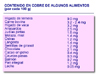 El cobre (Cu) es un oligoelemento esencial para numerosos procesos biológicos, siendo un cofactor o grupo prostético de numerosas enzimas y un elemento que influye sobre la expresión de muchos genes. Las concentraciones de cobre son mayores en el hígado, cerebro, corazón y riñones. Aunque el músculo muestra concentraciones de cobre poco elevadas, al constituir una masa importante representa el 40% del cobre presente en el organismo. El cobre se encuentra ampliamente distribuído en los alimentos, en especial en los productos de origen animal excepto la leche, de manera que es fácil cubrir las necesidades diarias de 0.7 a 3 mg. Los alimentos más ricos en cobre son las ostras, las vísceras animales (hígado, riñones, etc), el chocolate, los frutos secos y la carne (*) . El departamento de Agricultura de los EE.UU estima que las necesidades diarias de cobre son de 1.5 a 3 mg para los adultos y adolescentes y de 0.7 a 2 mg para los niños. |