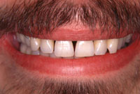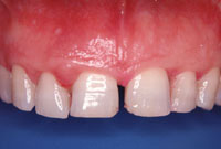 Joven mujer que muestra una importante pérdida ósea. En un lado se llevó a cabo la PPT y un levantamiento de papila en el otro lado |