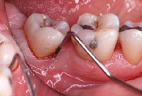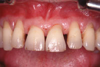 Paciente que muestra una lesión que lo hace candidato a una relleno óseo. En este caso, se practicó la técnica de la PPT para desbridar y poner hueso al descubierto pero sin utilizar membrana |